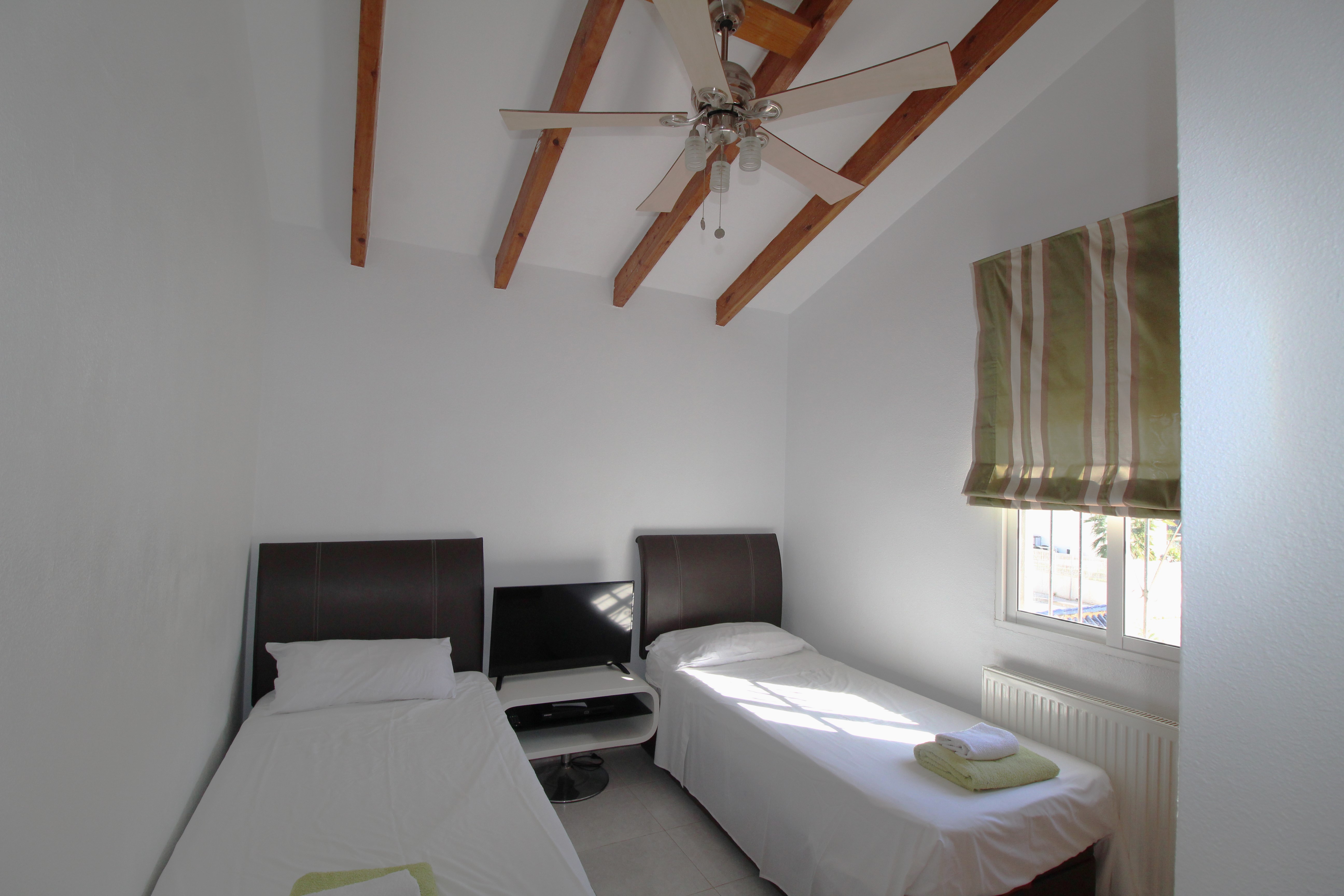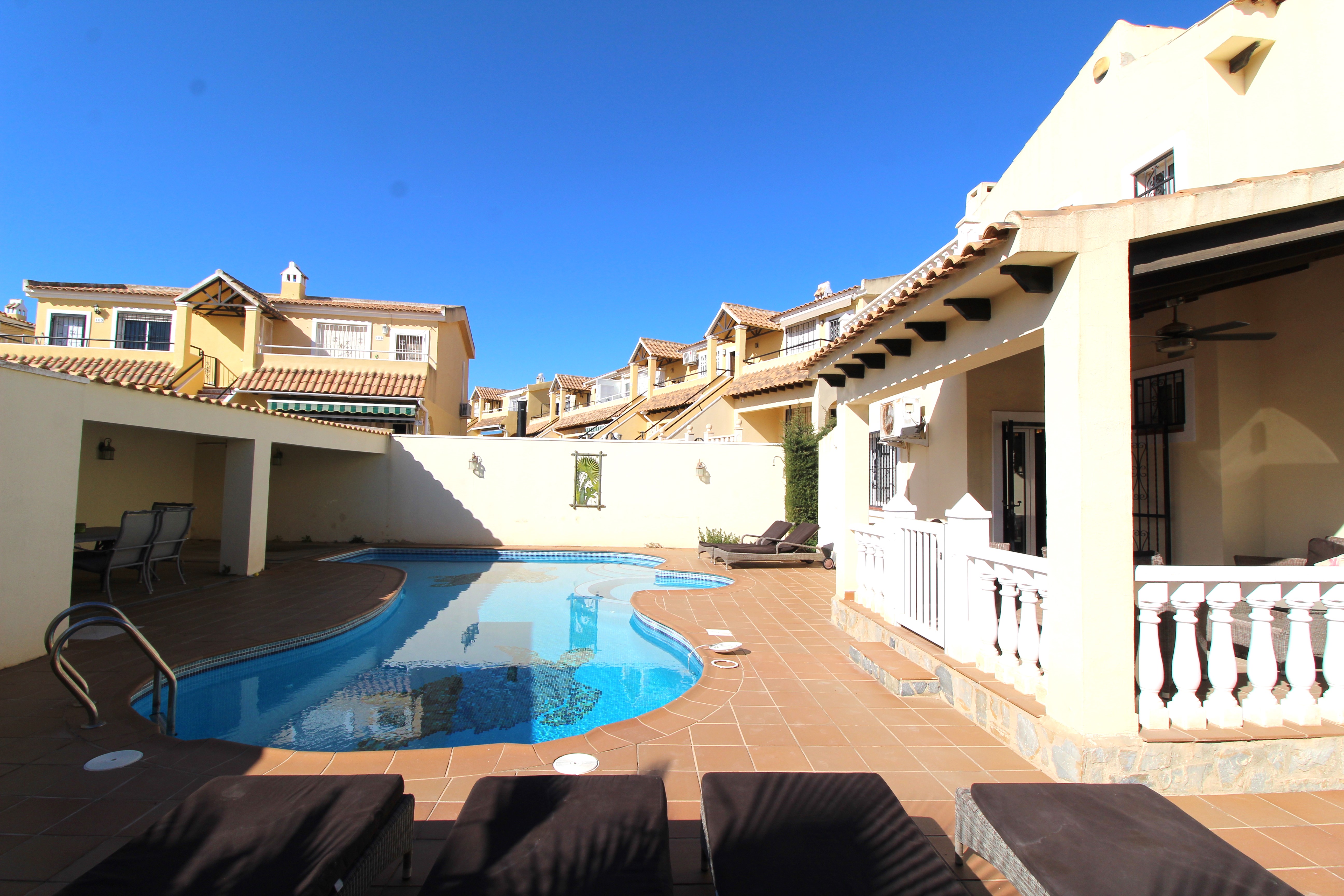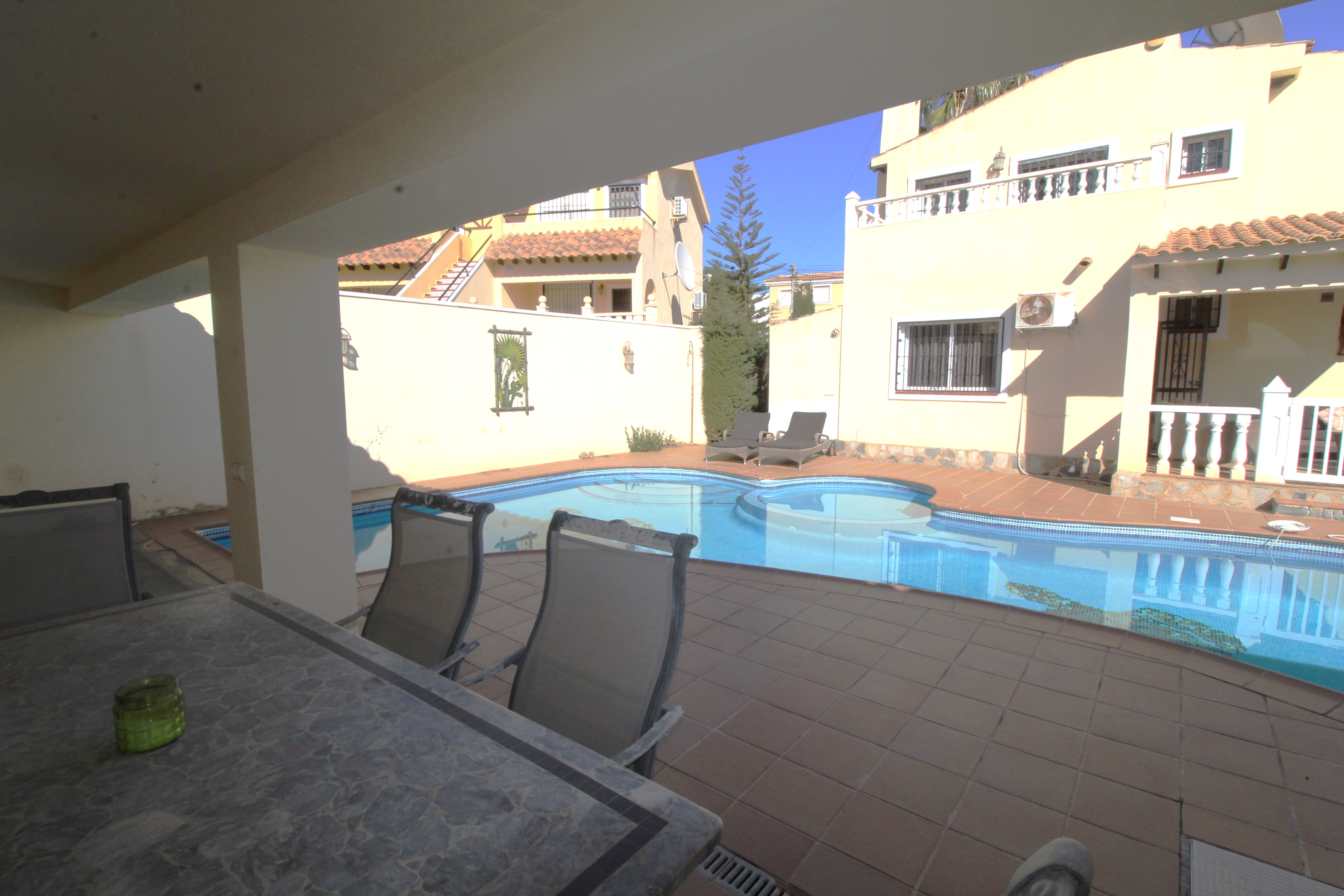 A beautiful 4 Bed 2 bath villa with a large private pool in Villamartin. This lovely furnished villa in situated a 15 minute walk from the Villamartin Plaza & Golf Course. It is an ideal family villa with a cot and 2 bunk beds provided in one of the bedrooms and safety gates throughout . There is a large outdoor area with a private pool, bar and kitchen area, there is a lovely terrace with safety gate outside overlooking the pool of the main living area and plenty of sunbeds to catch the year round sunshine. The living / dining area is stylishly furnished and leads into a very large modern kitchen, a downstairs wet room and a twin bedroom. There is a safety gate leading upstairs to the further three bedrooms and a large family bathroom. The large main bedroom is beautifully furnished and has a terrace with table and chairs. There is a twin room and a bedroom with bunk beds. There are many features of this villa including air conditioning, UK TV & WIFI and an outside pool table & table tennis table. It has everything you need for that perfect family holiday.