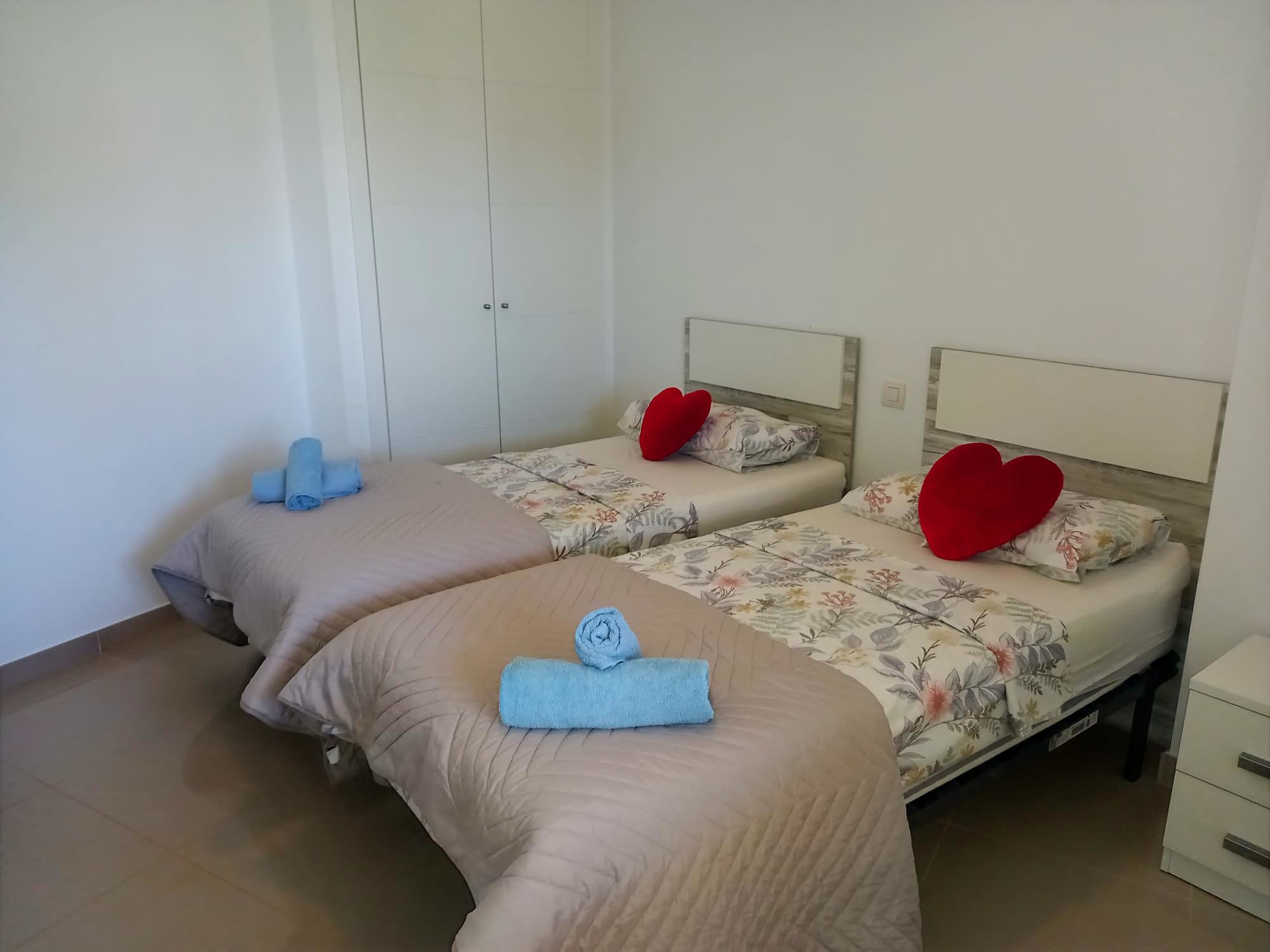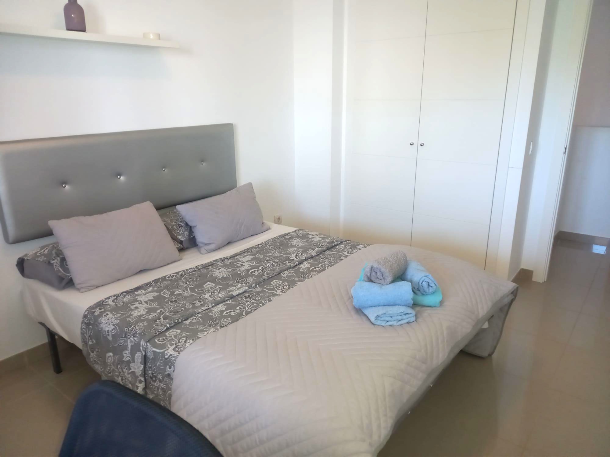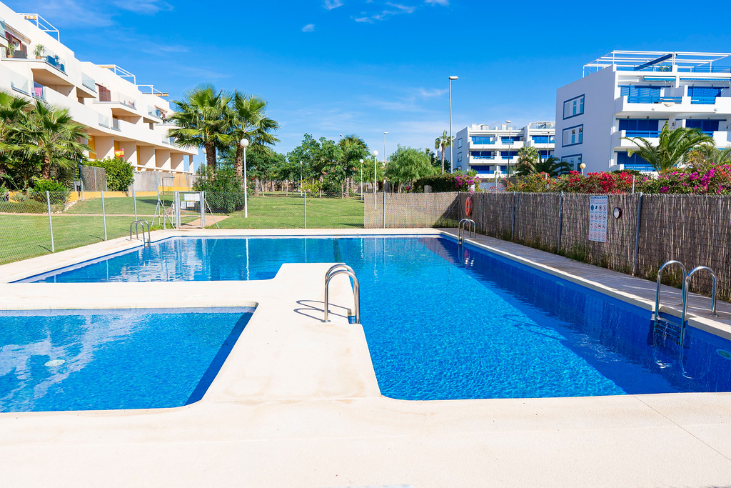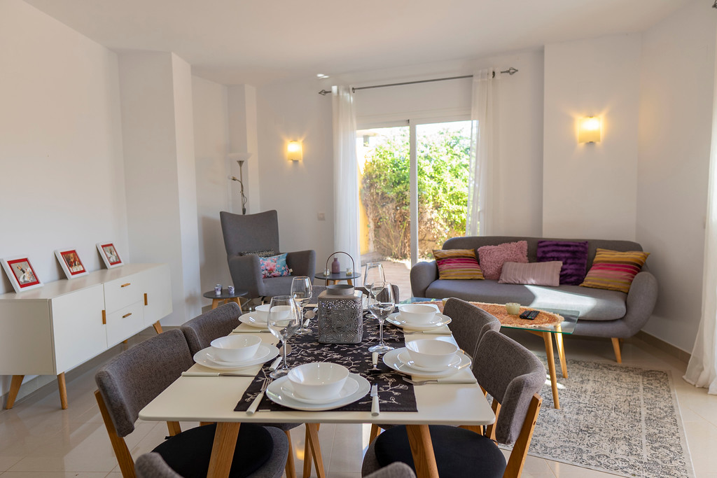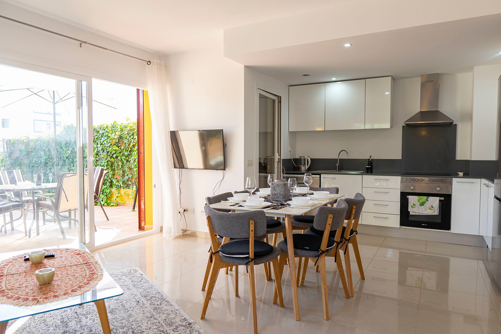 Luxury 3 Bed 3 Bath Ground Floor Duplex in Playa Flamenca in walking distance to bars, restaurants, the beach and all amenities. There is a large spacious private garden where you can enjoy al fresco dining with a BBQ and dining area and plenty of space for sunbathing. This is ideal for families with young children as the enclosed garden is fully fenced and private offering a secure area to play in. There is an open plan living area which is beautifully furnished with modern furniture and the kitchen is fully equipped with everything you need with modern appliances including a dishwasher, oven, hob, toaster, kettle, coffee machine and fridge freezer and all utensils necessary for home cooking . There is a separate utility room with a washing machine and all essential items available including beach chairs and mats. There is a flat screen TV and free WIFI and ducted air conditioning for those hot summer nights. There is a downstairs WC. There are 3 spacious bedrooms all with fitted wardrobes, a main double bedroom with an en suite shower room, a twin bedroom and a double sofa bed with a desk area. The family bathroom has a large shower area. There is free private parking and a large communal pool in landscaped gardens in a secure gated complex with cc tv videophone entry system. All bedrooms and bathrooms have mosquito nets so windows can be opened for fresh air. It is close to the Playa Flamenca Centre with plenty of bars, restaurants, banks and supermarkets. Close by is a fun area with go karts, sky dive wind tunnel and rides for the children and a large rooftop mini golf area. The beach is only a short walk away and a lovely coastal walkway takes you from Punta Prima to Cabo Roig.