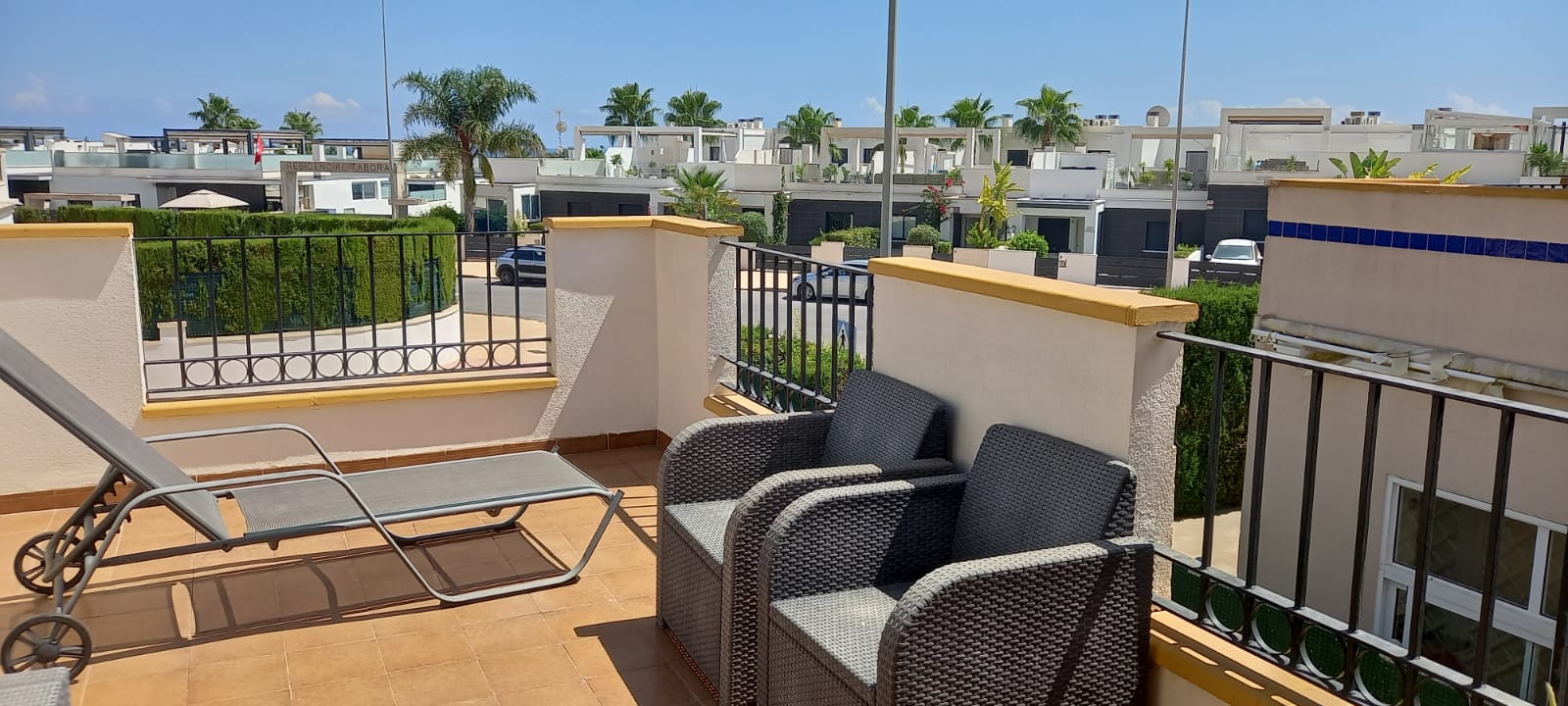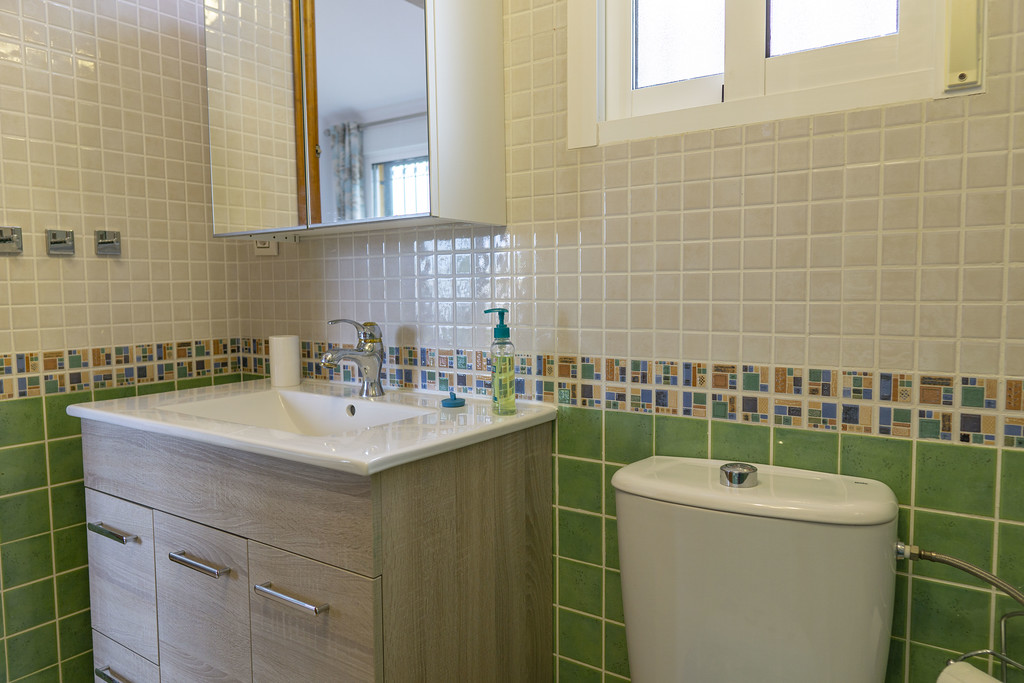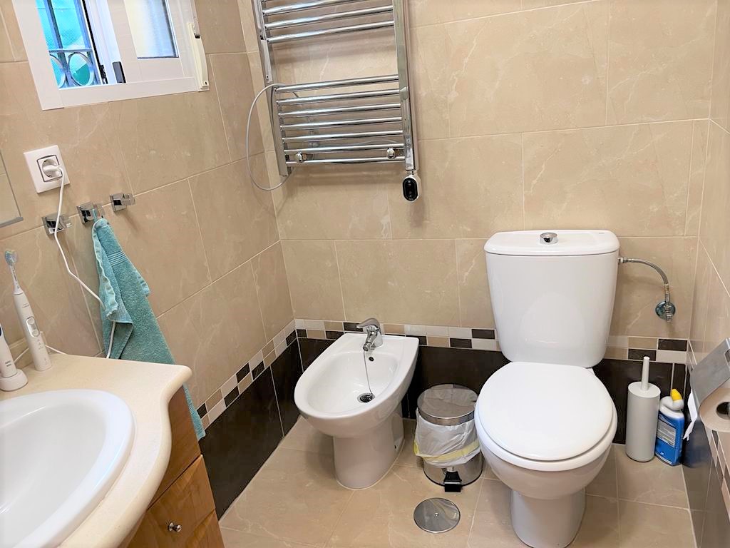 There are three bedrooms in the property , The first bedroom is a single and located downstairs with Air Con and Fitted Wardrobes. Upstairs is a double bedroom with an en suite shower, with Aircon and fitted wardrobes and also access to a large Sunny terrace with sun loungers and seating. The second bedroom is a twin room with Air Con and fitted wardrobes, There are two bathrooms one downstairs and one en suite