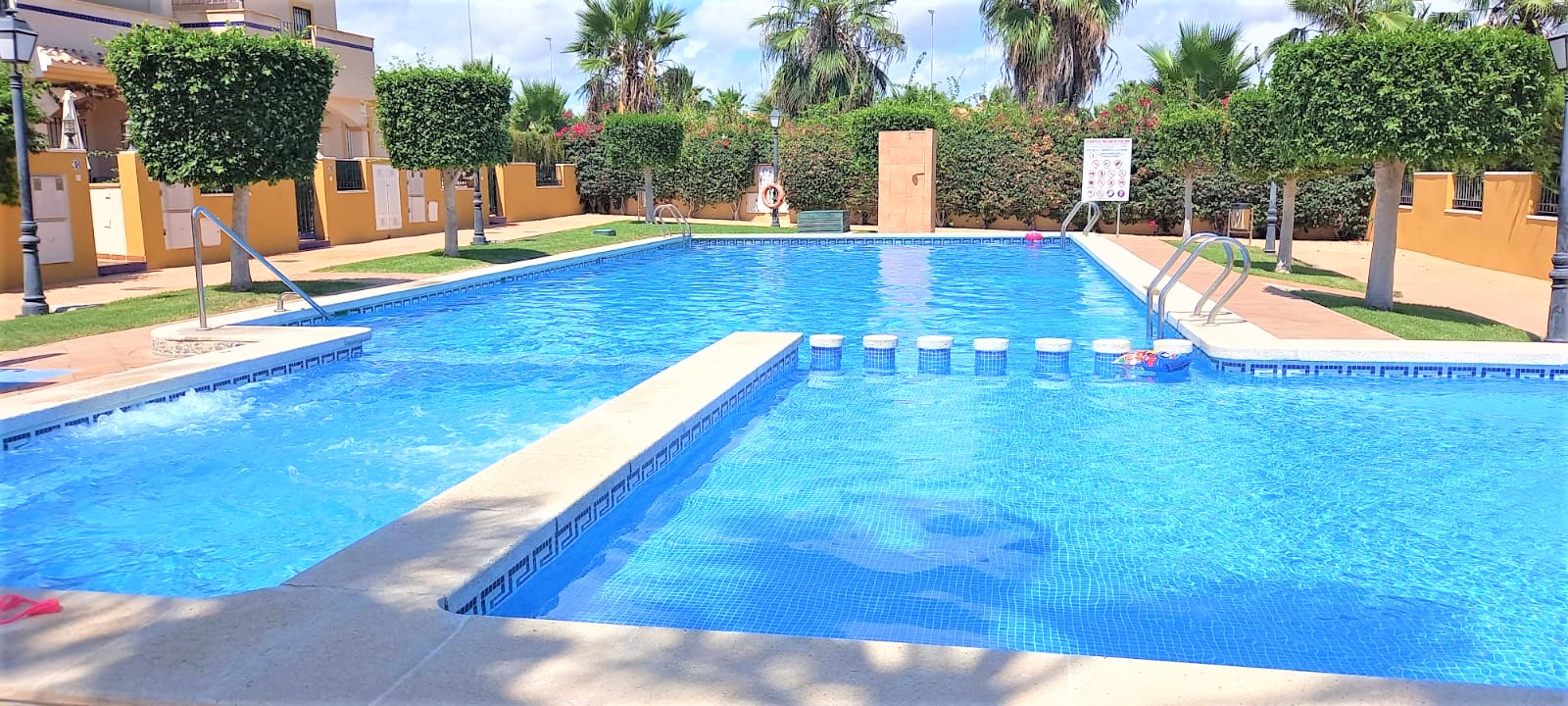 It has a lovely communal pool area with landscaped gardens and a pergola covering a seated area