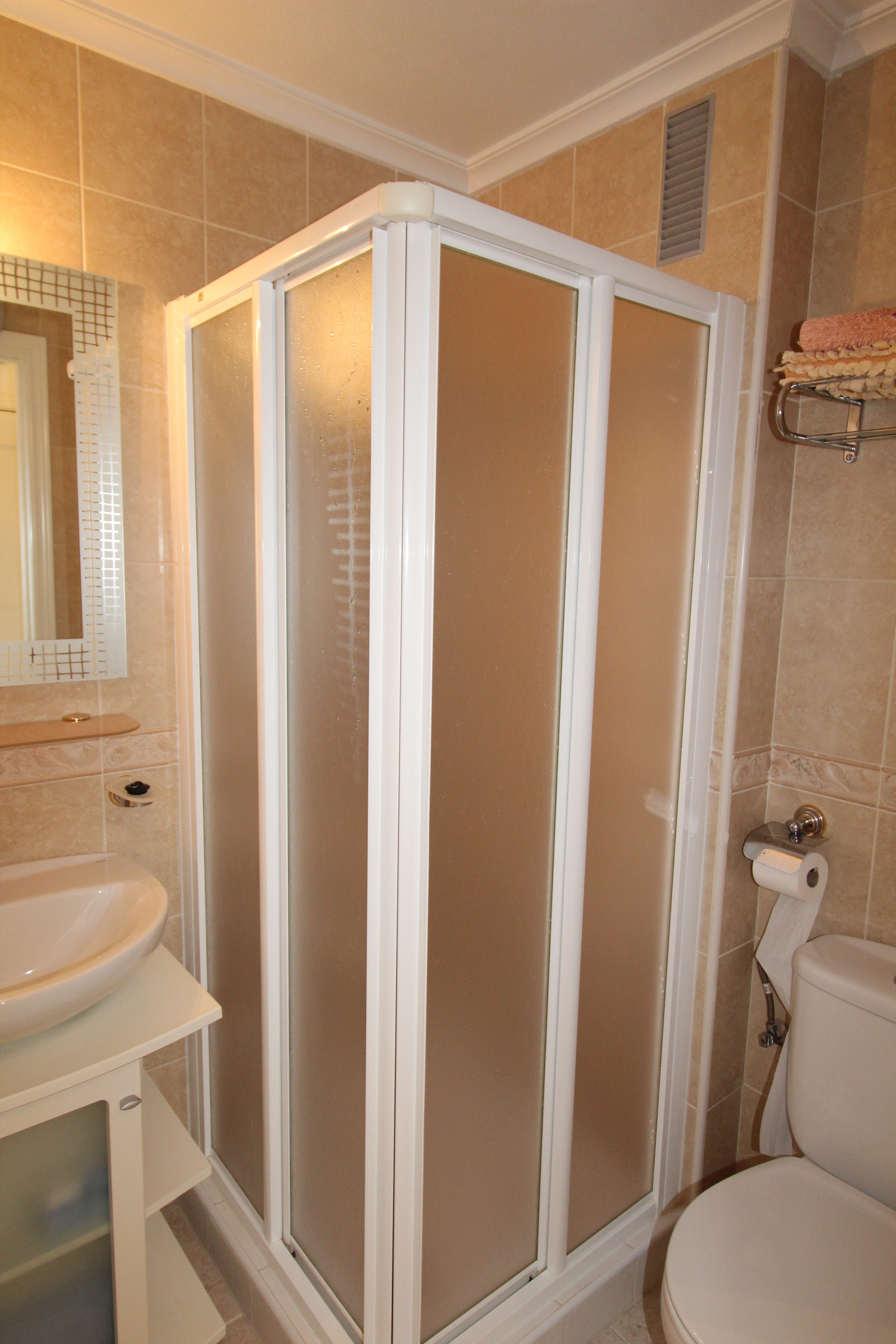 The apartment’s bright and airy open-plan living room leads into a modern fully-fitted kitchen, providing all the necessary amenities for a comfortable stay. The double bedroom features fitted wardrobes, while the twin bedroom is perfect for children or friends sharing. Both bathrooms are modern and offer walk in showers. The sunny south facing terrace is ideal for soaking up the sun while enjoying a cooling drink with lovely views.