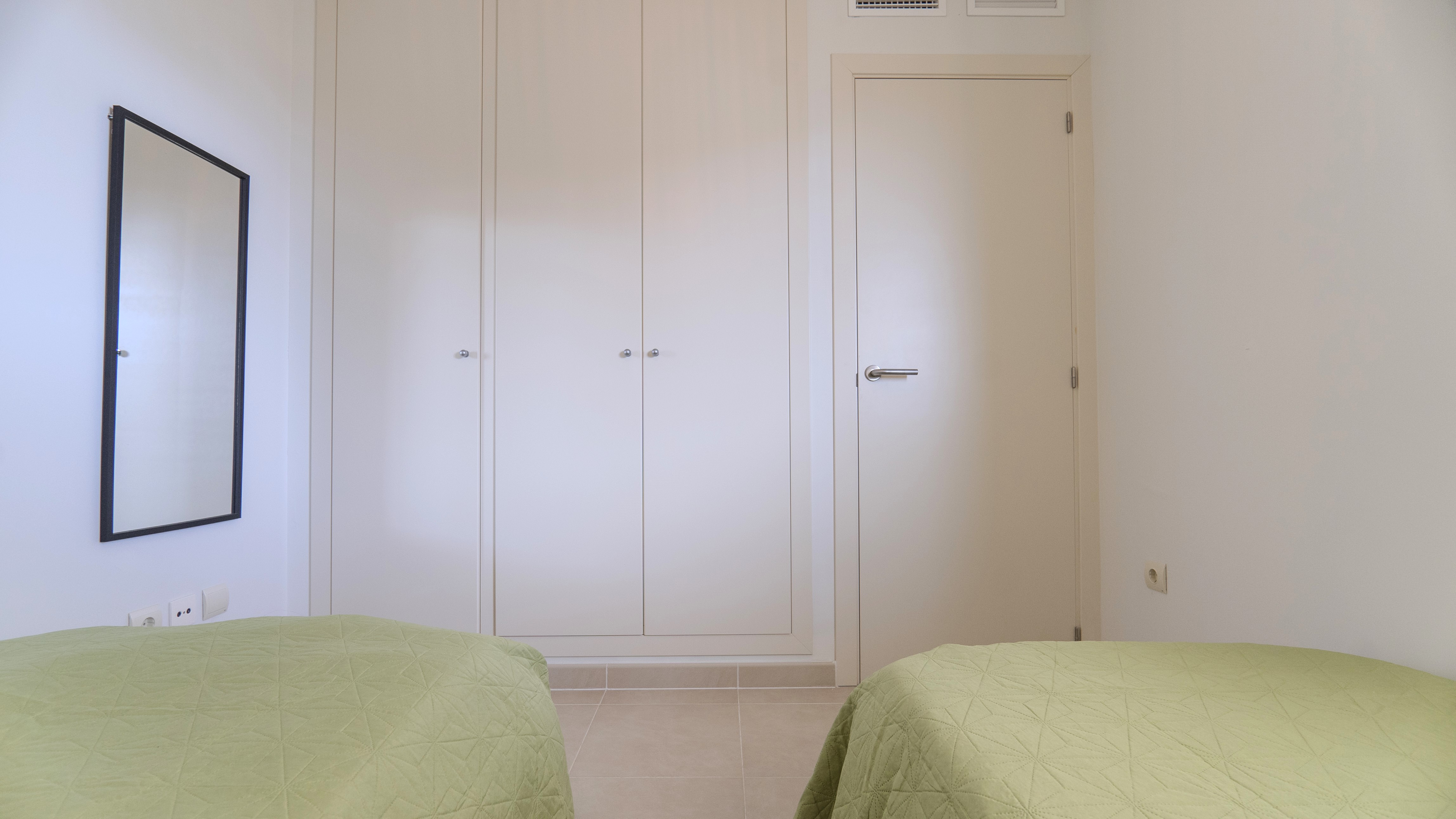 The spacious master bedroom features a comfortable double bed and an en-suite bathroom, complete with both a shower and a bathtub. The second bedroom is fitted with two twin beds. Both bedrooms come with built-in wardrobes, providing ample storage and comfort. Stay cool during the summer with the ducted air conditioning, or take a refreshing dip in the communal pool to beat the heat.