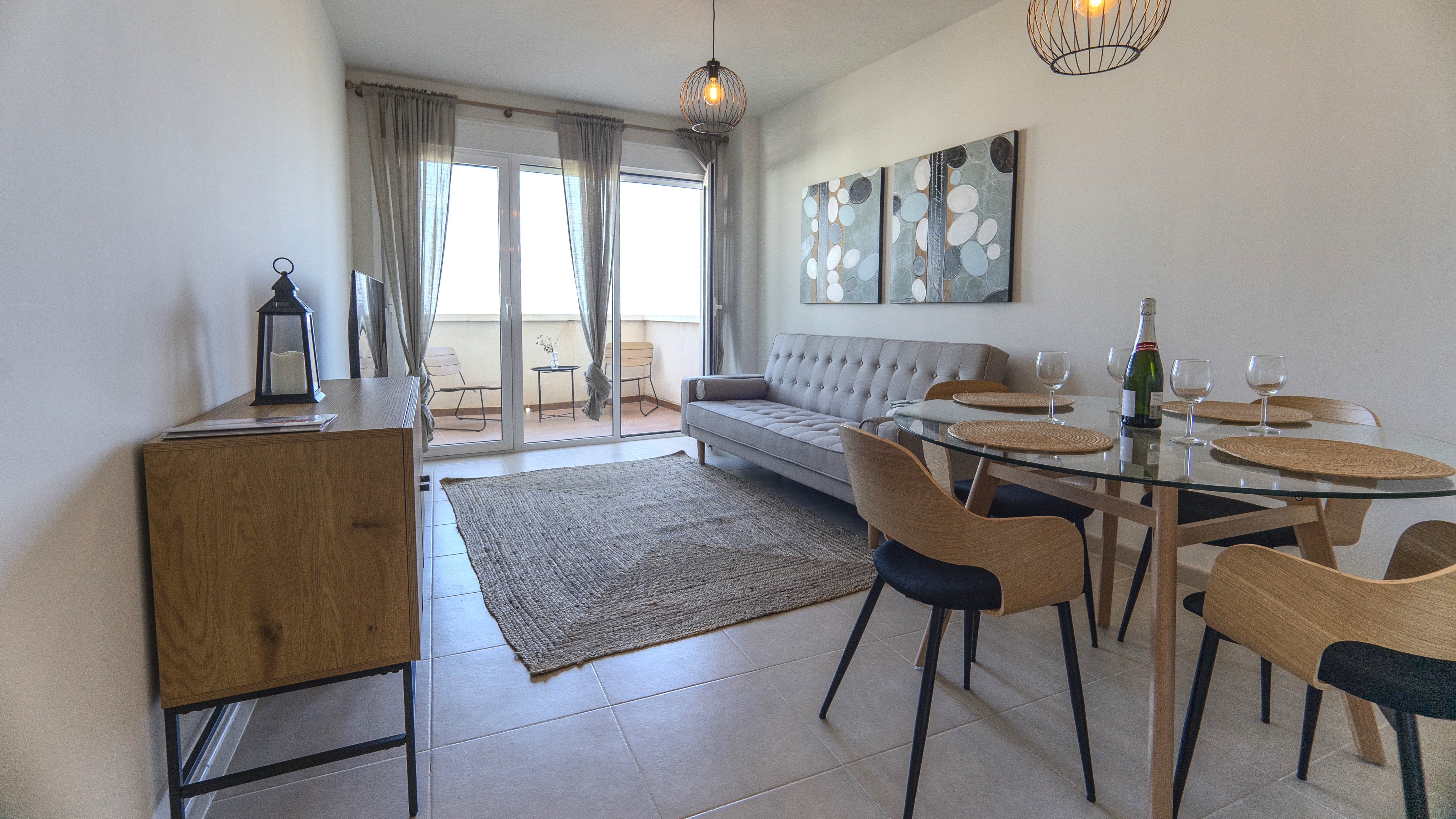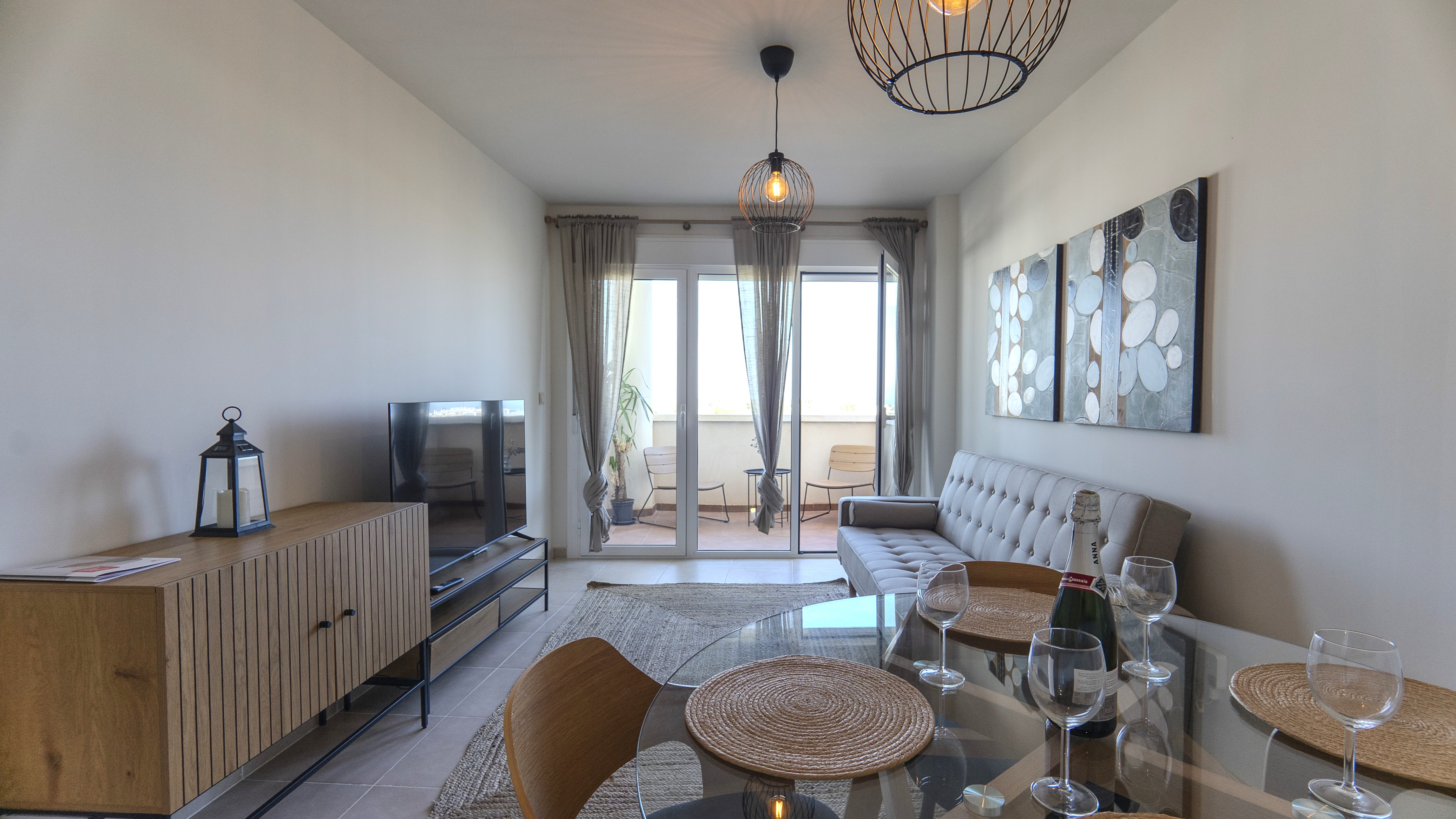 This modern 2-bedroom apartment has been fully refurbished to the highest standards, blending contemporary design with boho warmth. Relax on the terrace and enjoy the scenic views. As you step inside, you are welcomed by an open-plan living space that seamlessly integrates the living room and kitchen. The kitchen is fully equipped with all the essentials, including a fridge-freezer, dishwasher, microwave, coffee machine, and toaster. Whether preparing a meal or catching up with loved ones, you can stay connected thanks to the open layout, which also offers a view of the smart TV. The living room opens onto the terrace, offering an effortless indoor-outdoor living experience.