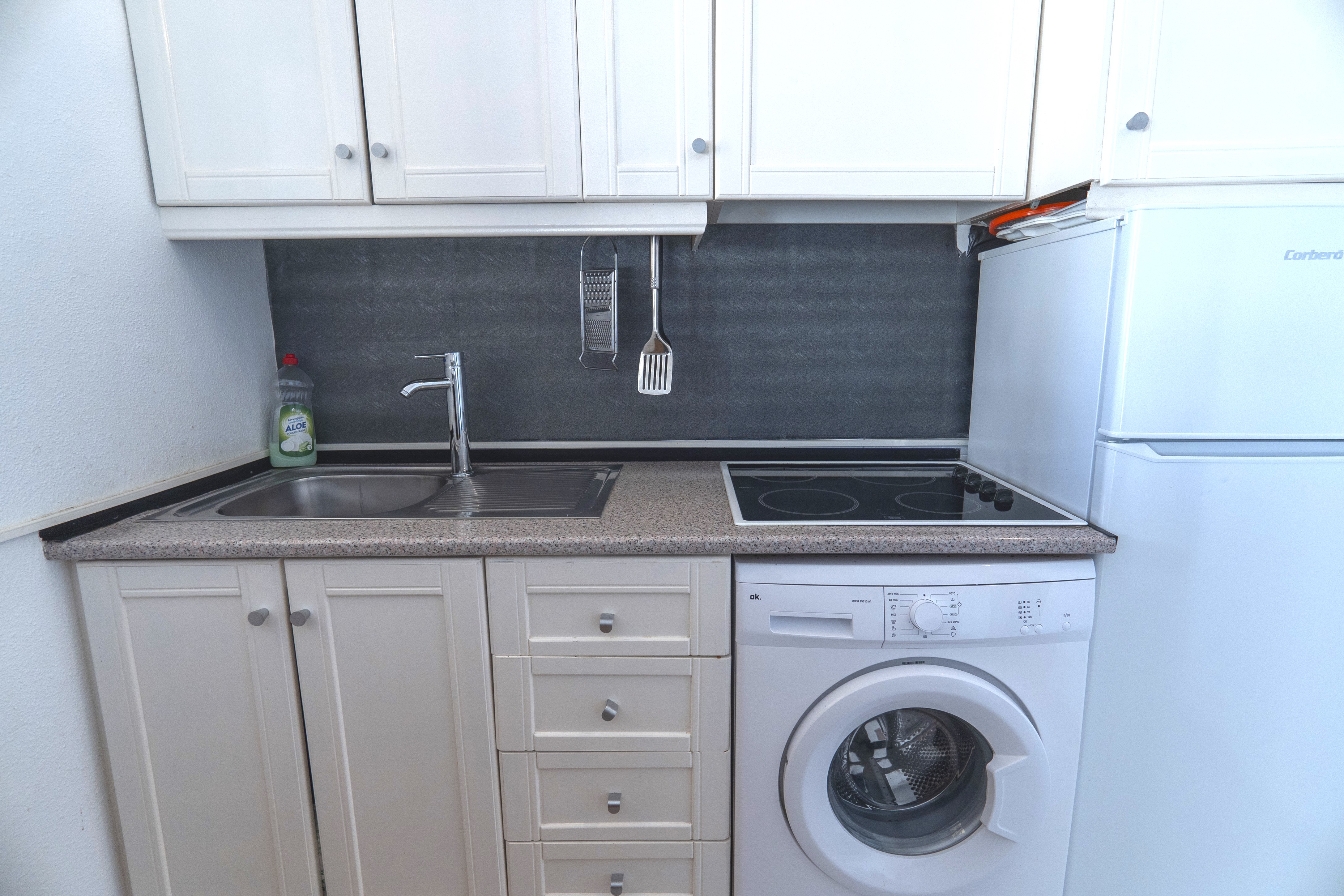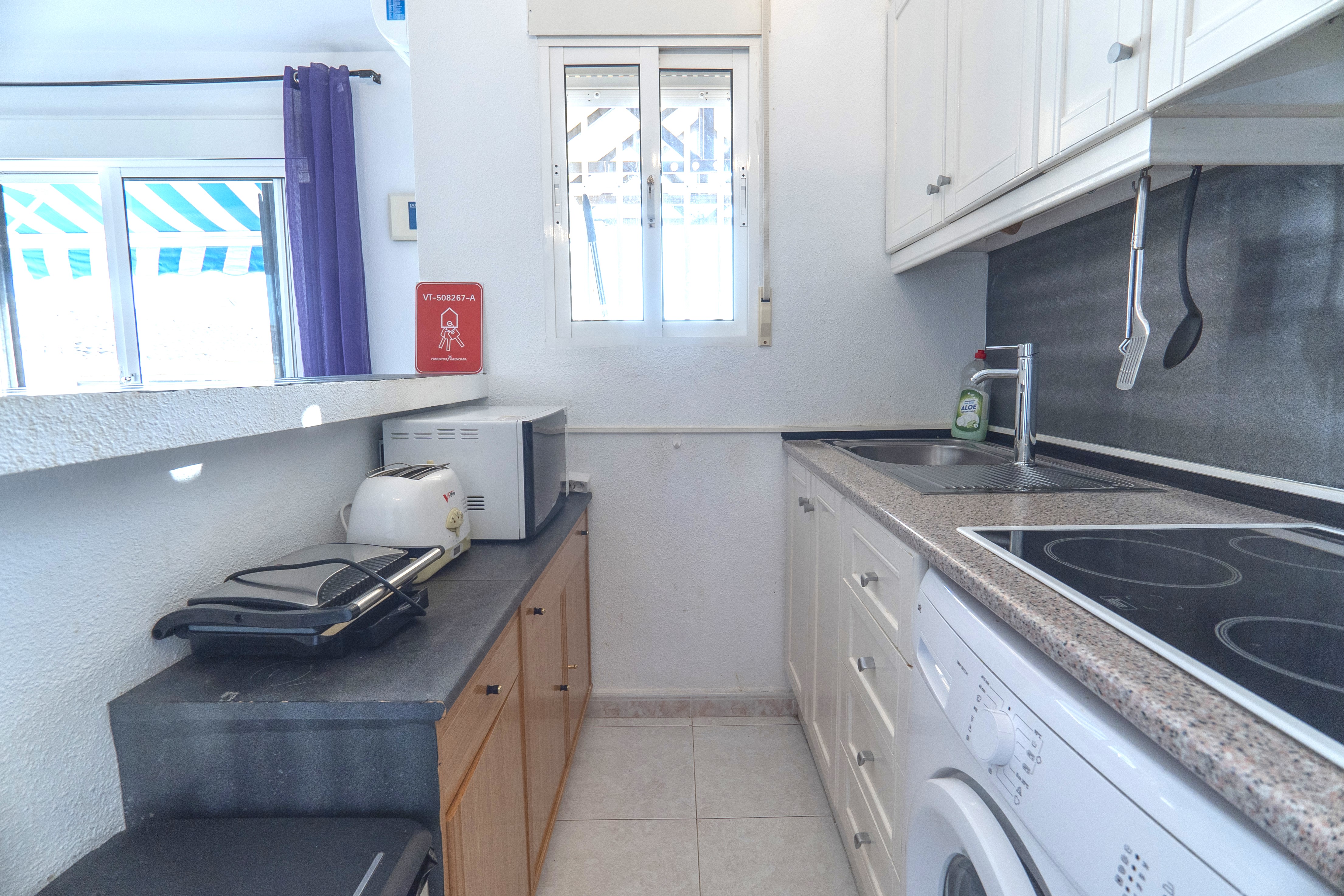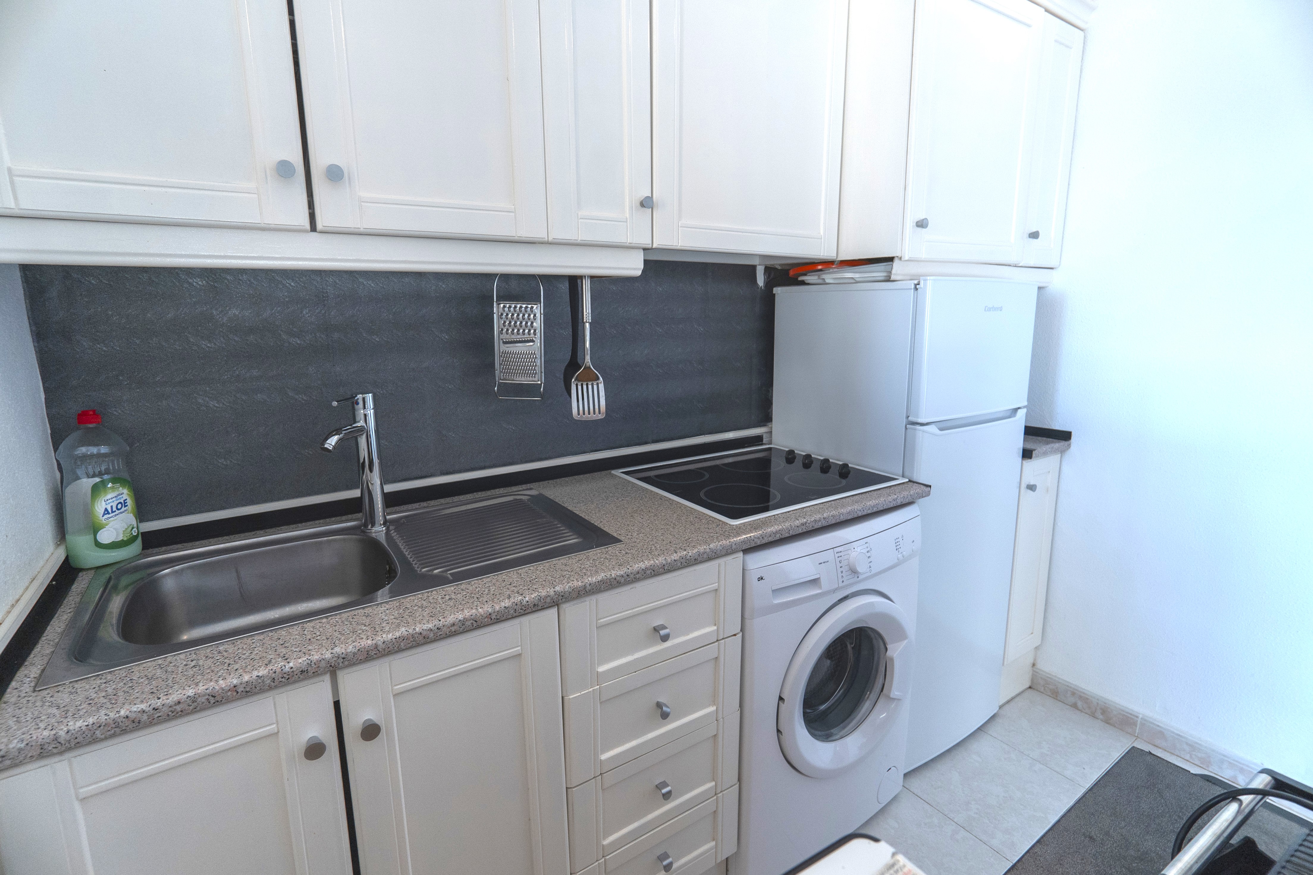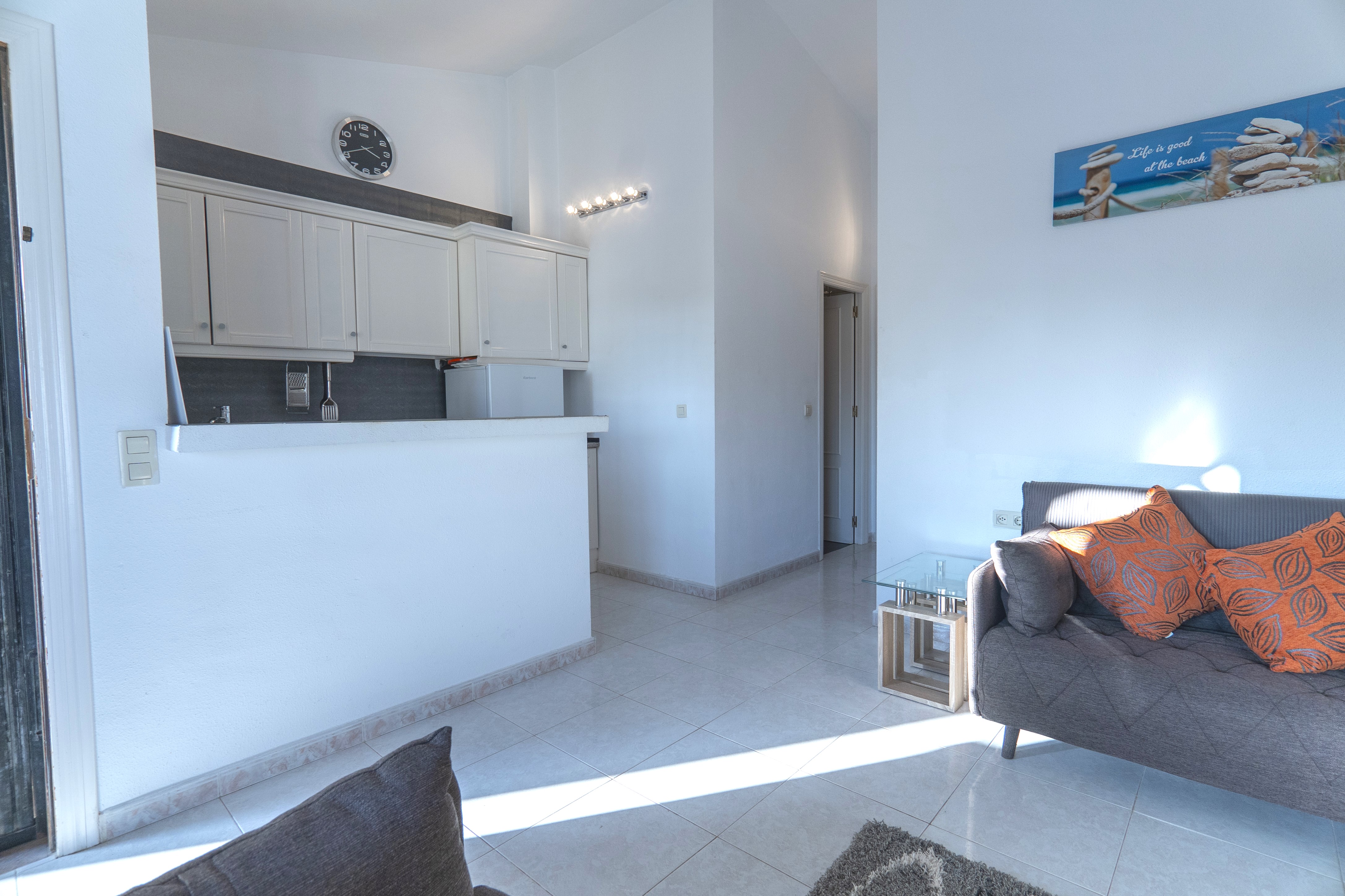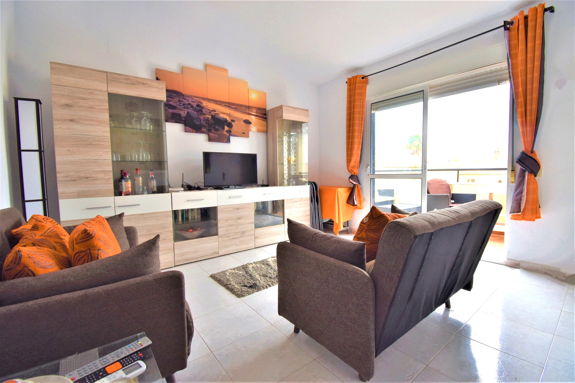 A stylish 2 bed 2 bath apartment overlooking the communal pool and close to the Villamartin Plaza Golf Complex. The living room is bright and airy and there is air conditioning in the living room and bedroom. Next is the kitchen with fridge freeze, hob, microwave and air fryer should you want to rustle up a meal. The balcony has views over the communal pool and is south facing to make the most of the sunshine. The master bedroom has a double bed and built in wardrobes along with air conditioning. The 2nd bedroom has single beds also and built in wardrobes. There is also a recently renovated family bathroom with a shower enclosure.